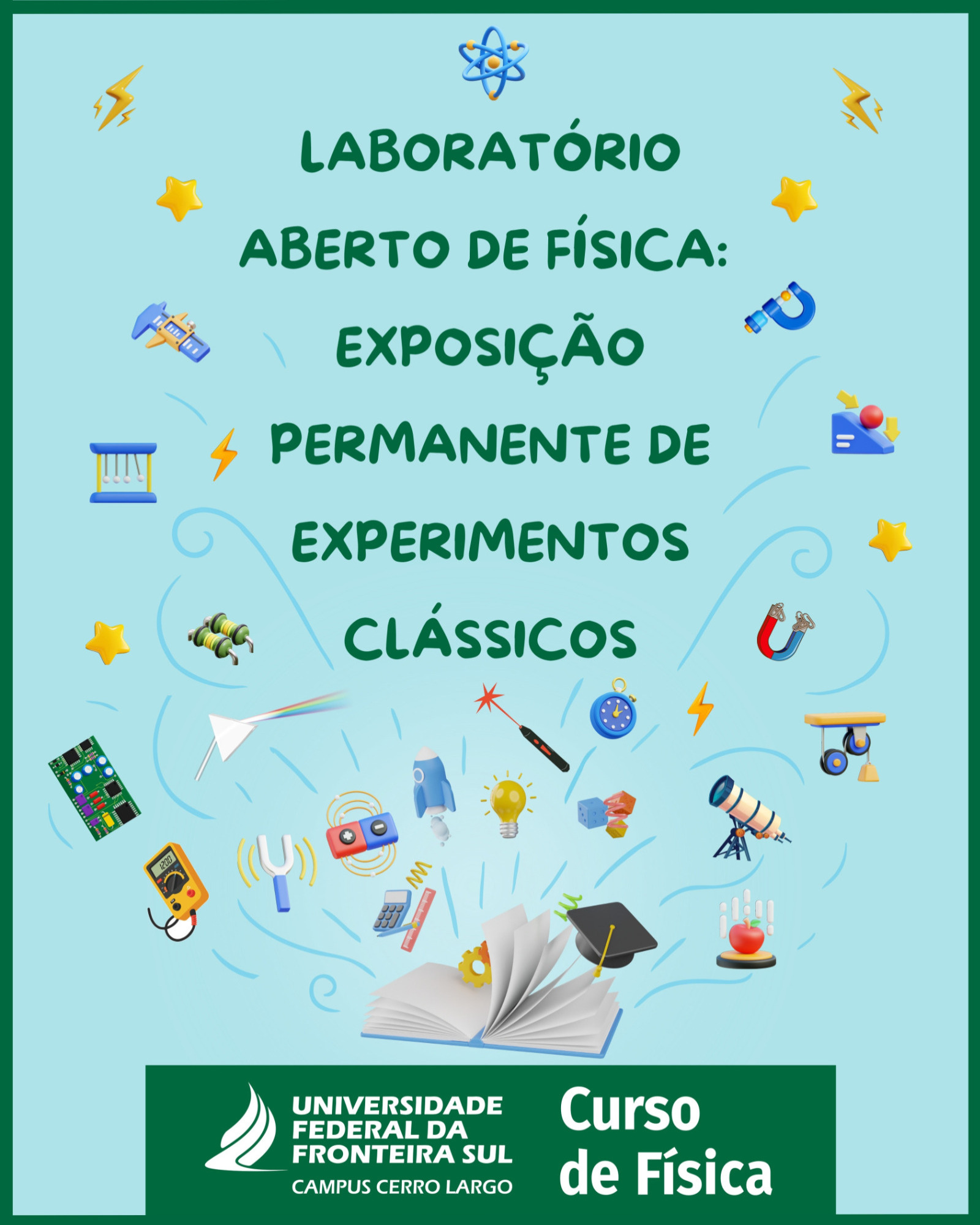 Entre as ações de extensão desenvolvidas no curso, destaca-se o projeto “Laboratório Aberto de Física: exposição permanente de experimentos clássicos”, coordenado pelo Professor Dr. Márcio Pinheiro. A proposta institui um espaço permanente de experimentação científica no campus Cerro Largo, destinado à visitação de escolas e da comunidade em geral, mediante agendamento prévio pelos canais oficiais do curso (e-mail, WhatsApp ou Instagram @fisica.uffs.cl). A partir de experimentos clássicos que marcaram a evolução da Física entre os séculos XVII e XX, o projeto favorece a integração entre teoria e prática, contribuindo para a alfabetização científica e para a compreensão de conceitos fundamentais que dão suporte a temas contemporâneos previstos na BNCC, como a Física Moderna e Contemporânea.