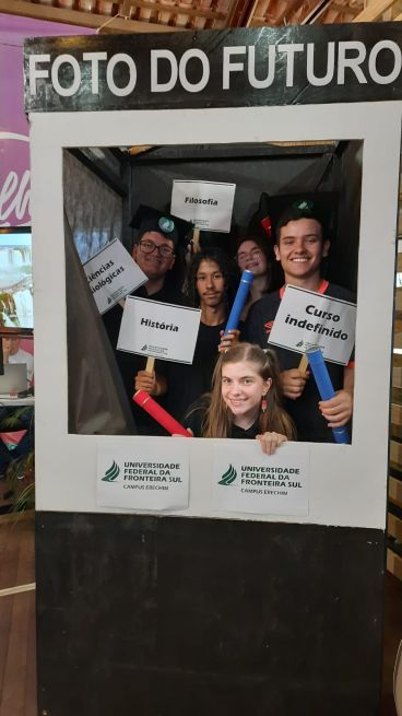 As escolas da região estão levando seus alunos para os espaços da feira. No estande da UFFS, elas se divertem com a caixa de areia que simula uma realidade aumentada, projetando formas de terreno em tempo real. Há também materiais da Brinquedoteca e o espaço da “Foto do Futuro”, onde os visitantes podem tirar uma foto simulando estarem em uma solenidade de formatura. A Instituição também apresenta um estereoscópio, objeto que possibilita a visão tridimensional a partir da utilização de um par de fotografias. São utilizadas imagens feitas com drone, possibilitando visualizar alguns locais do Campus em uma visão 3D.