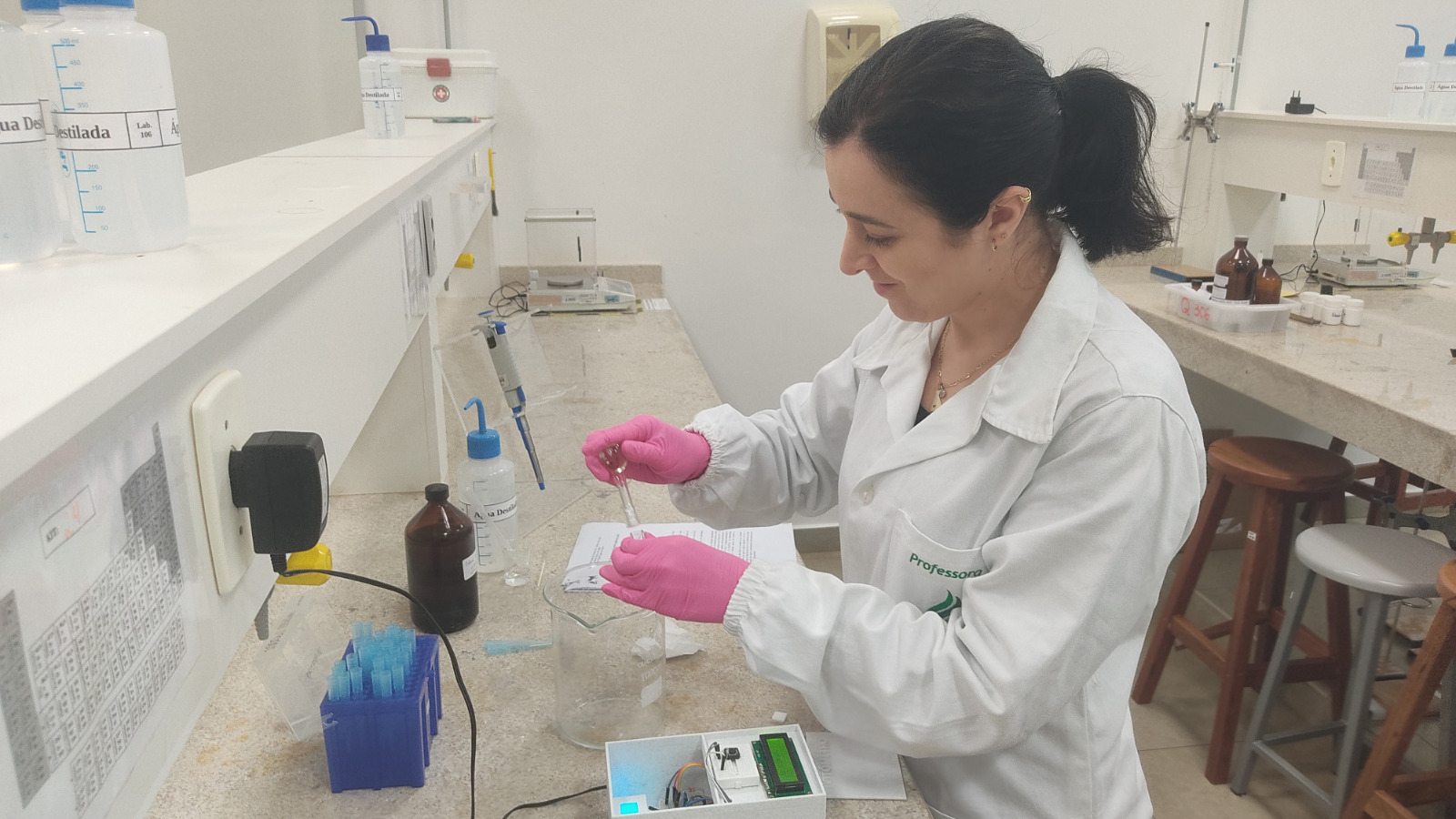 Dentro da tutoria da professora Marlei, a atividade consistiu na construção de um fotômetro, um instrumento que mede amostras com base na quantidade de luz que elas absorvem ou transmitem. É usado para determinar a concentração de uma substância em solução, aproveitando a relação entre intensidade da luz e quantidade de matéria presente. “A construção do fotômetro foi muito mais do que montar um equipamento, foi uma forma de aproximar a ciência da realidade delas, mostrando que é possível fazer pesquisa, aprender e se encantar com o conhecimento mesmo dentro da escola pública”, explicou.