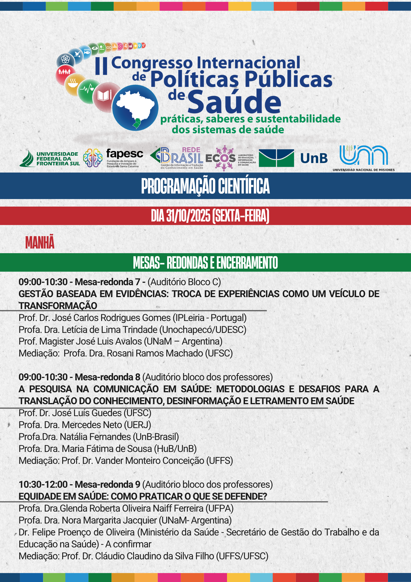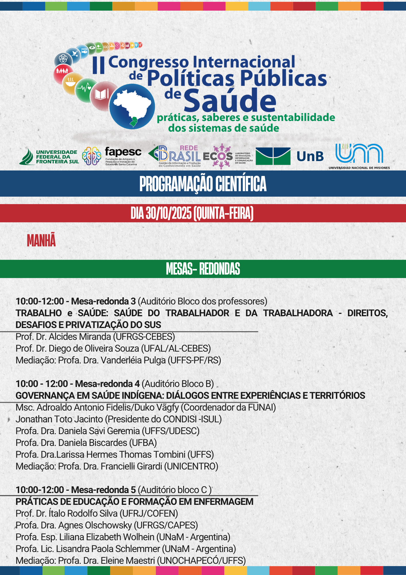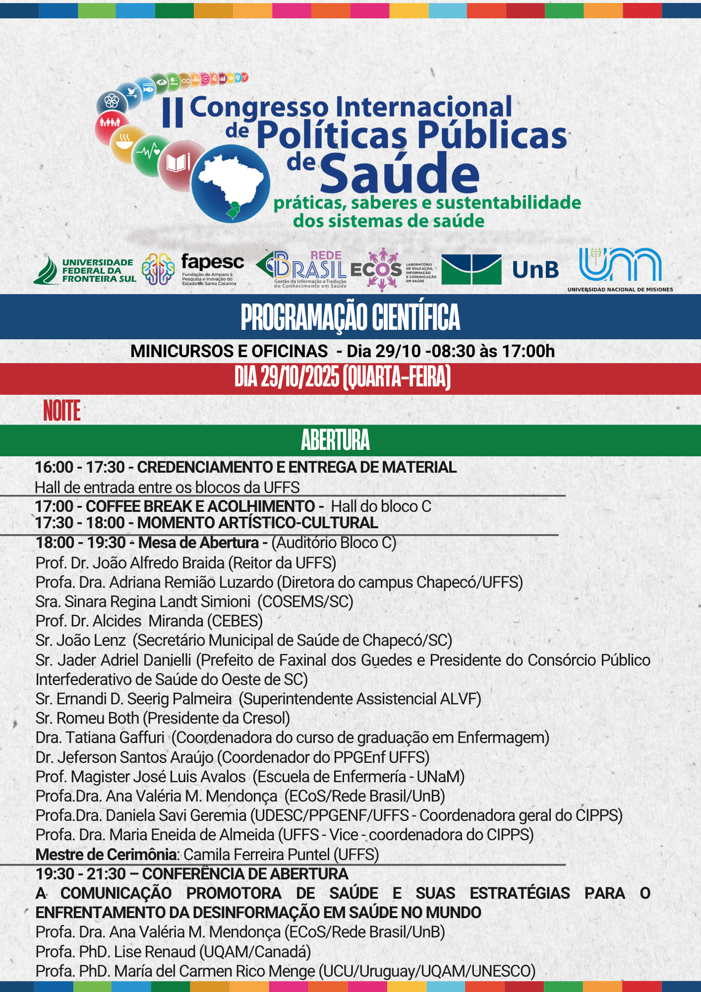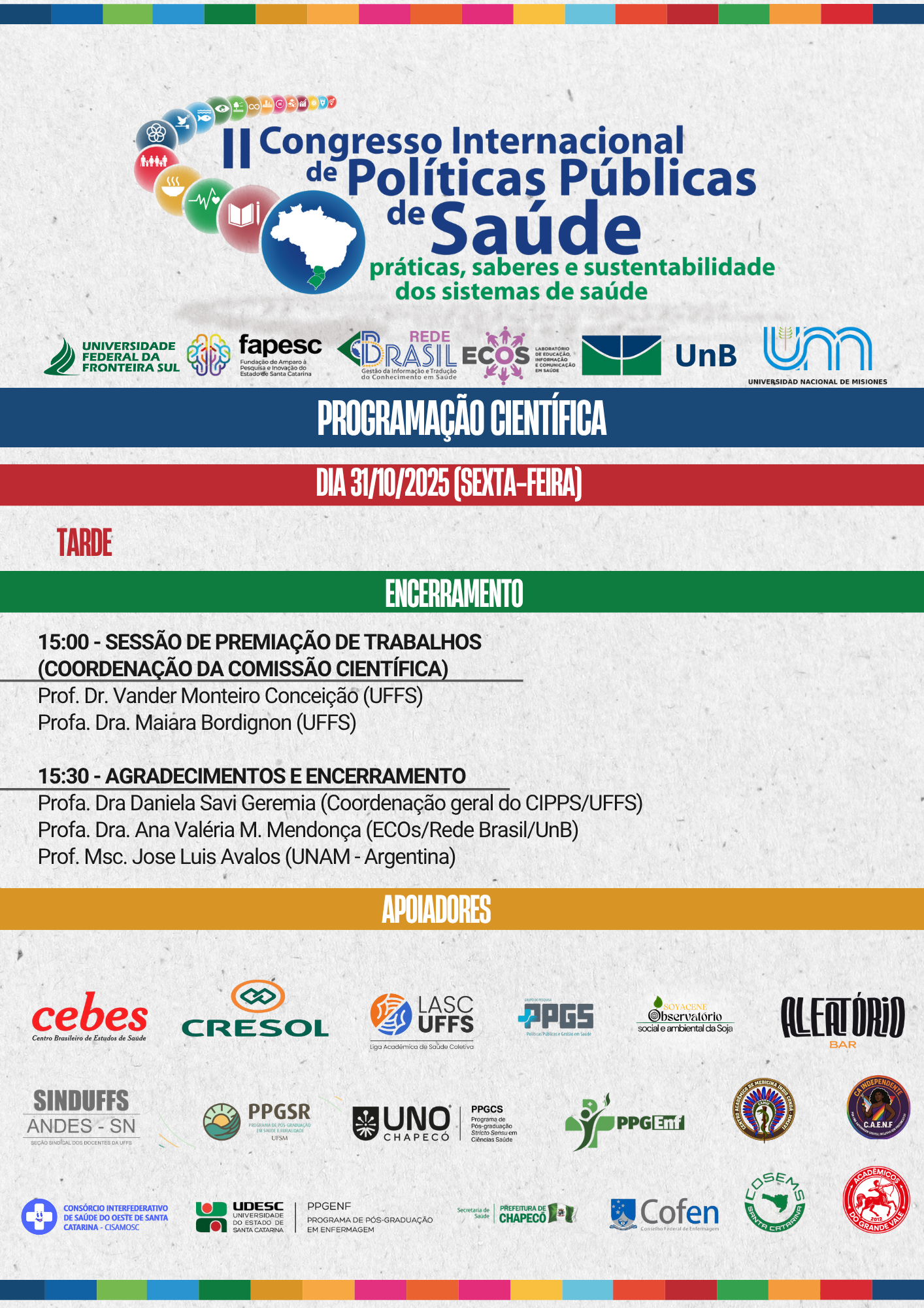 O congresso é organizado pela UFFS, por meio do PPGEnf, com participação de membros dos cursos de Enfermagem e Medicina (campi Chapecó e Passo Fundo); do ECOS/UnB (Laboratório de Educação, Informação e Comunicação em Saúde); da Rede Brasil: Gestão da Informação e Tradução do Conhecimento; e da Escuela de Enfermería da Universidad Nacional de Misiones (UnaM/Argentina). O evento conta com apoio financeiro da FAPESC e mantém parcerias nacionais e internacionais. “Sem organizadores e apoiadores, o congresso não acontece; agradecemos a todas as instituições parceiras”, destaca a professora Maria Eneida. “Ainda há inscrições para ouvintes. Queremos casa cheia, diálogo qualificado e impacto social”, comenta a professora.