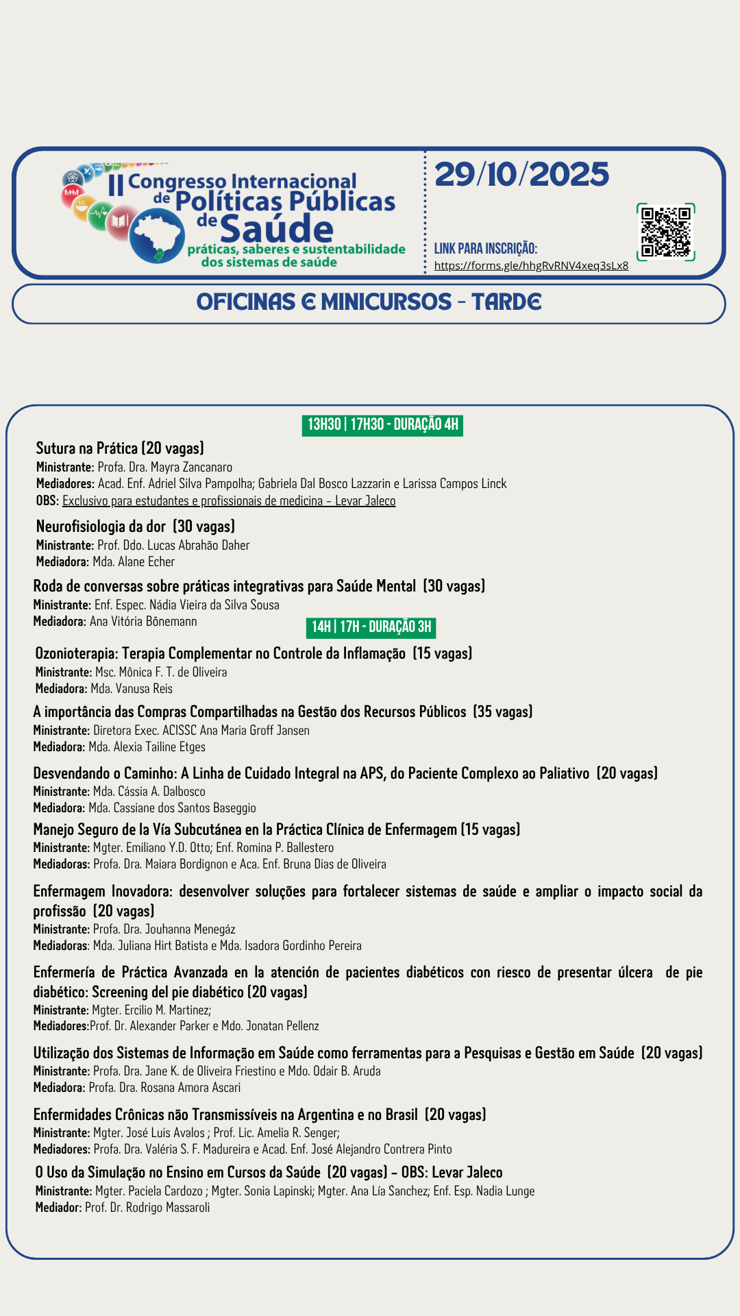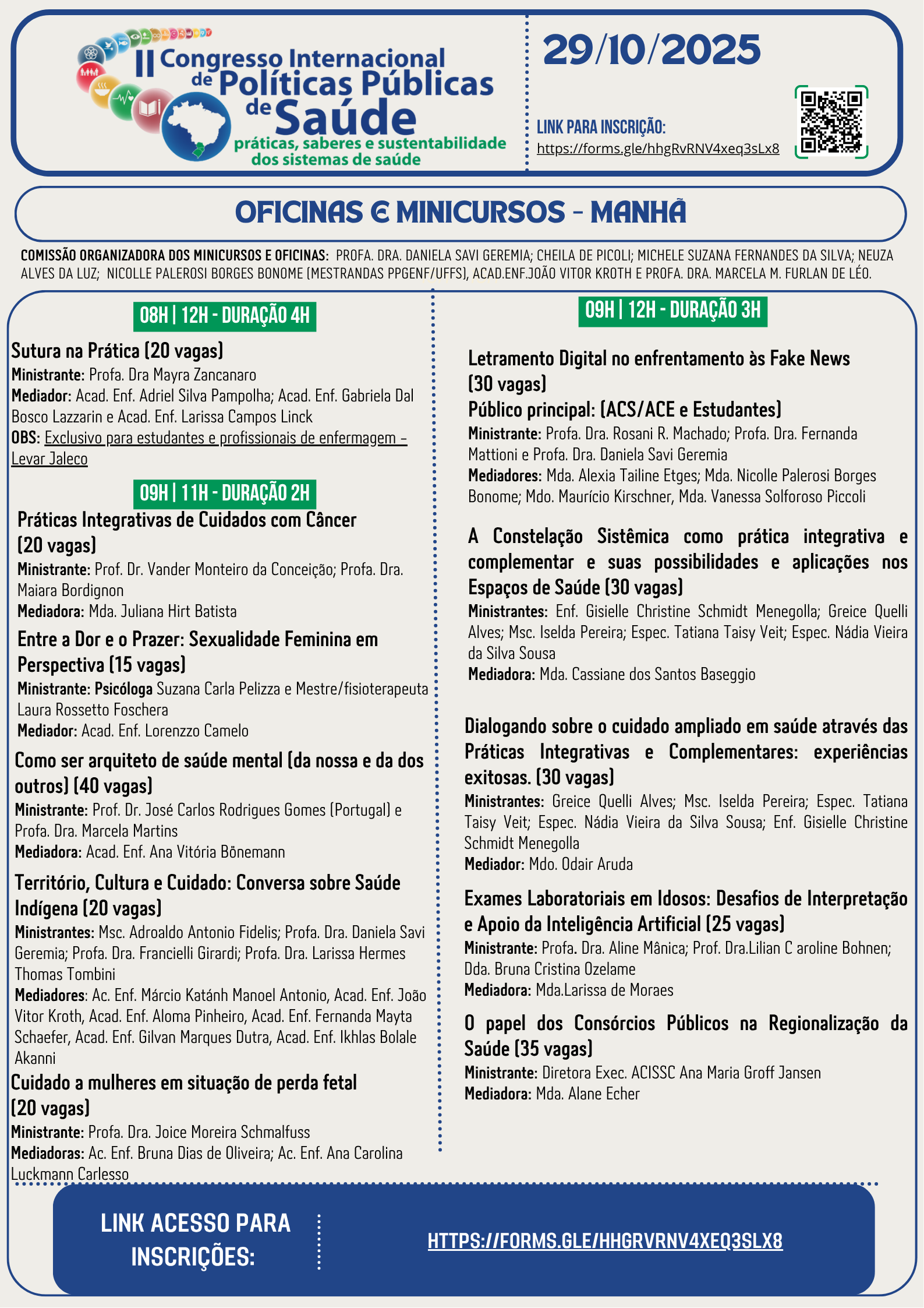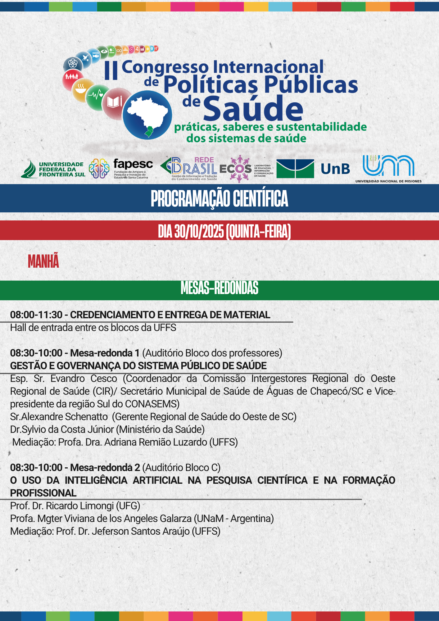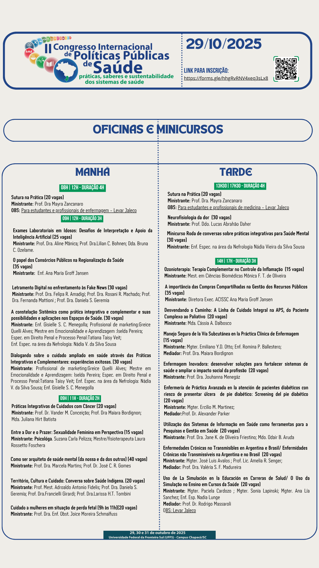 O congresso é organizado pela UFFS, por meio do PPGEnf, com participação de membros dos cursos de Enfermagem e Medicina (campi Chapecó e Passo Fundo); do ECOS/UnB (Laboratório de Educação, Informação e Comunicação em Saúde); da Rede Brasil: Gestão da Informação e Tradução do Conhecimento; e da Escuela de Enfermería da Universidad Nacional de Misiones (UnaM/Argentina). O evento conta com apoio financeiro da FAPESC e mantém parcerias nacionais e internacionais. “Sem organizadores e apoiadores, o congresso não acontece; agradecemos a todas as instituições parceiras”, destaca a professora Maria Eneida. “Ainda há inscrições para ouvintes. Queremos casa cheia, diálogo qualificado e impacto social”, comenta a professora.