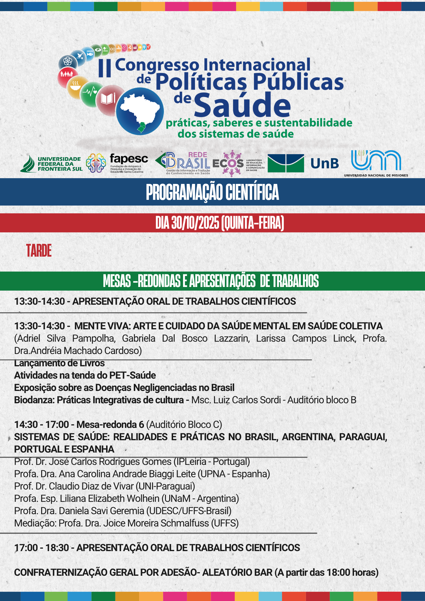 A Universidade Federal da Fronteira Sul (UFFS) realiza a 2ª edição do Congresso Internacional de Políticas Públicas de Saúde: Práticas, Saberes e Sustentabilidade dos Sistemas de Saúde (II CIPPS), de 29 a 31 de outubro. Reunindo estudantes, pesquisadores, profissionais da saúde, gestores públicos e movimentos sociais, o congresso objetiva que os participantes contribuam com soluções aos desafios do SUS e da sociedade. As inscrições para participação como ouvintes estão abertas neste link.