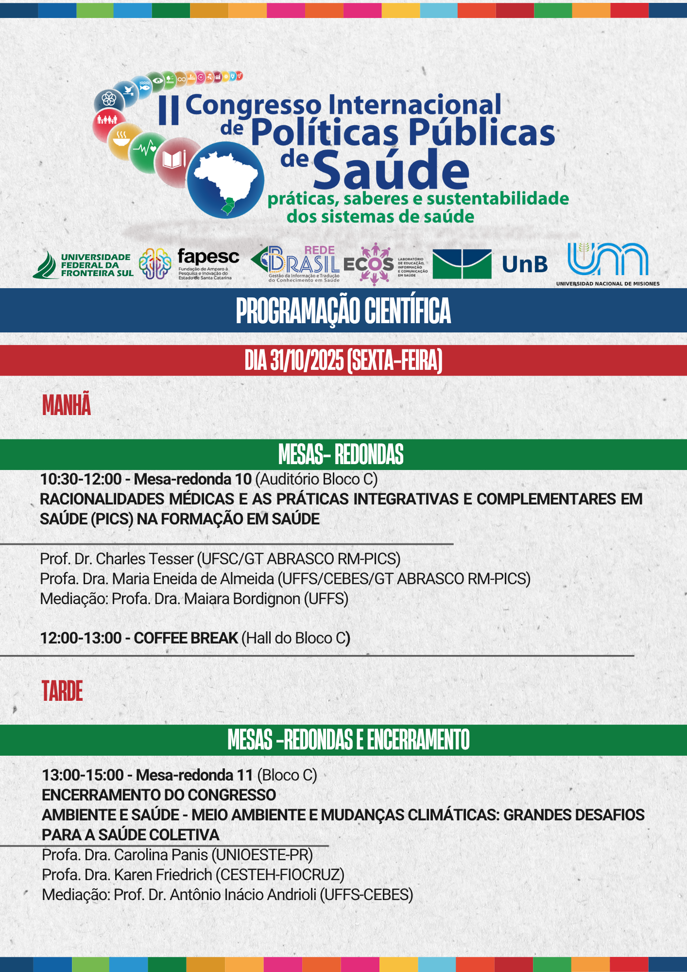 A edição deste ano está organizada em cinco eixos: 1. Desinformação, informação e tradução do conhecimento em saúde; 2. Políticas, gestão em saúde, saúde digital e tecnologias na saúde; 3. Racionalidades médicas e práticas integrativas em saúde; 4. Formação e práticas de cuidado em saúde; e 5. Saúde, trabalho, ambiente e sustentabilidade.