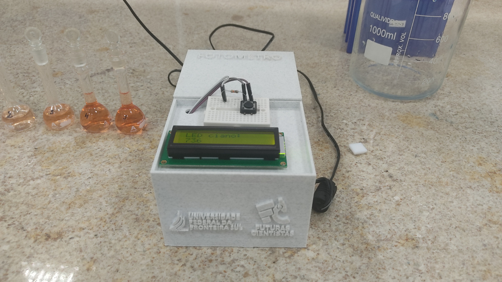 Dentro da tutoria da professora Marlei, a atividade consistiu na construção de um fotômetro, um instrumento que mede amostras com base na quantidade de luz que elas absorvem ou transmitem. É usado para determinar a concentração de uma substância em solução, aproveitando a relação entre intensidade da luz e quantidade de matéria presente. “A construção do fotômetro foi muito mais do que montar um equipamento, foi uma forma de aproximar a ciência da realidade delas, mostrando que é possível fazer pesquisa, aprender e se encantar com o conhecimento mesmo dentro da escola pública”, explicou.
